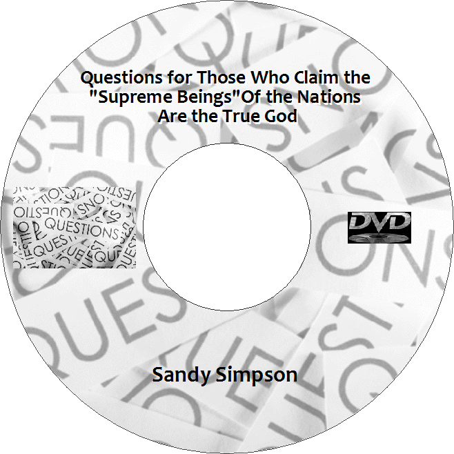 Of the Nations Are the True God by Sandy Simpson, 10/14/13 This DVD is a message based on this article. I have some questions for those of the World Christian Gathering of Indigenous People (WCGIP) adherents such as Don Richardson, Daniel Kikawa, Richard Twiss (deceased), Terry LeBlanc, Danny Lehman, Aloha Ke Akua, YWAM as well as many in the Emergent Church (EC) ... the questions arise from their claim that the "supreme beings" of the nations are all the True God, YHWH, the God of Abraham, Isaac and Jacob. You can read more on this subject in our book "Idolatry In Their Hearts" or in the WCGIP section of my site. My main question for them is this: When did ANY of the Patriarchs and Prophets in the Old Testament and the Apostles or Jesus Christ in the New Testament EVER claim that the "supreme beings" of the nations were Elohim/YHWH, the one True God? Let's look at some examples in the form of questions and you can check out the source links as well. Only $10. plus s/h. for US.