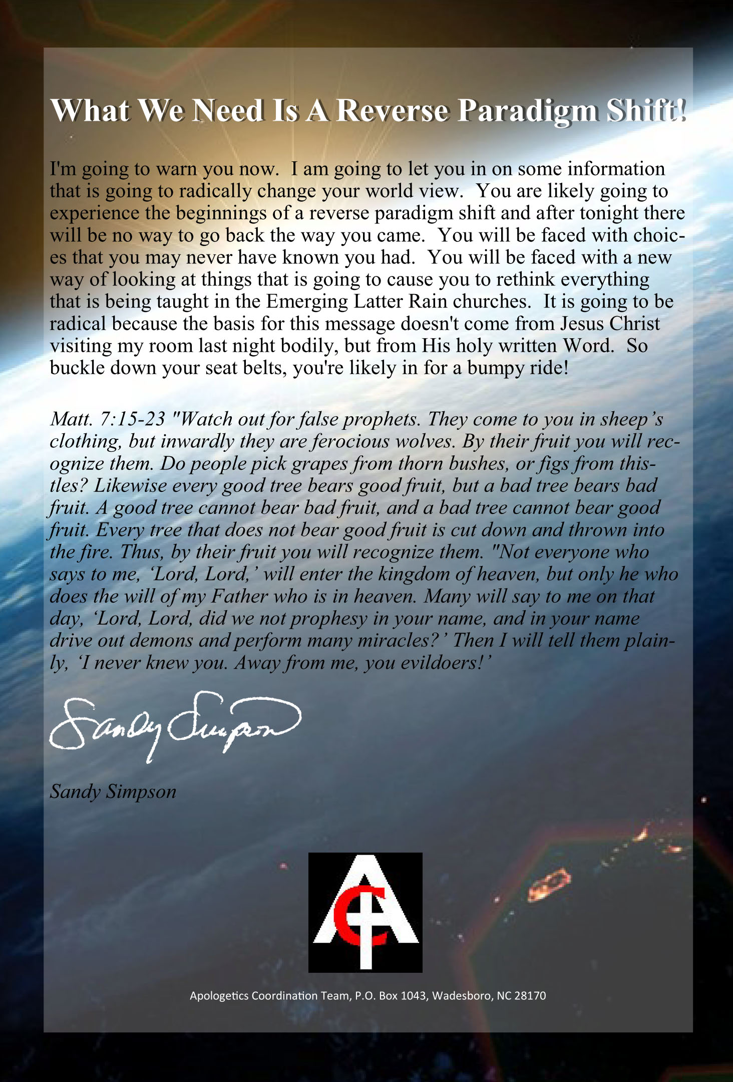 ultimately destroy the faith of many.We are clearly living in the Apostasy foretold in the